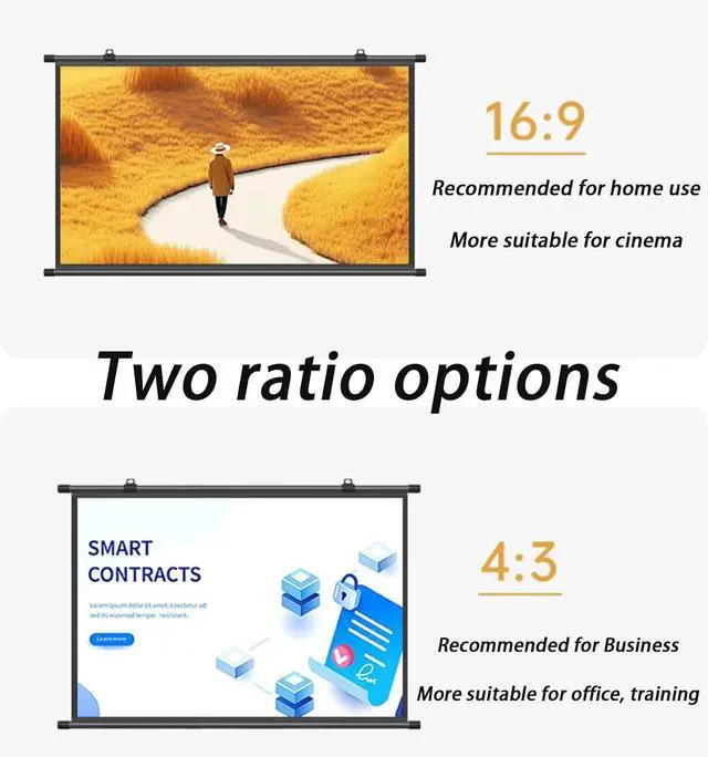 Screen format: The projection screen adopts 4:3 16:9 screen format. The 16:9 rectangular ratio is suitable for home use, and the 4:3 square ratio is suitable for office use. The theater screen supports 4K and full HD images, bringing you excellent visual enjoyment. .
