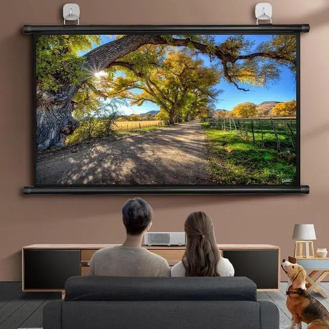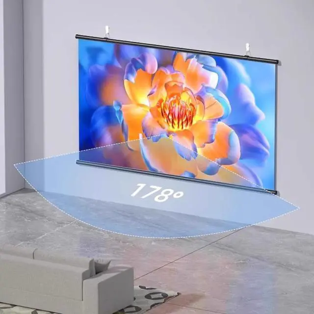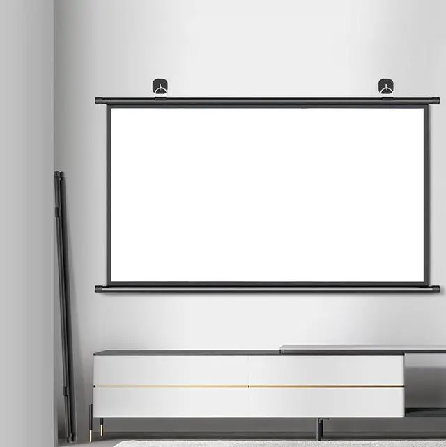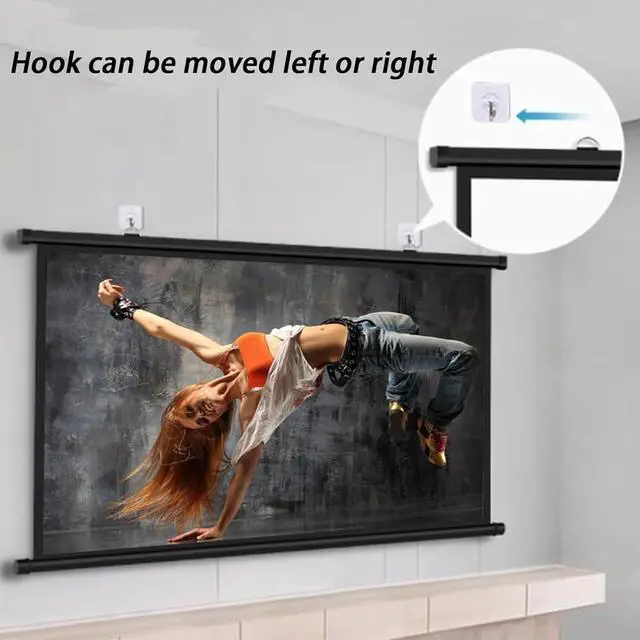 Quick and easy installation: Forget about complicated installations! Our manual projection screens only take minutes to install. Just install a hook on the wall and hang the screen on the hook. The screen seamlessly retracts when not in use, optimizing space while maintaining a discreet appeal.