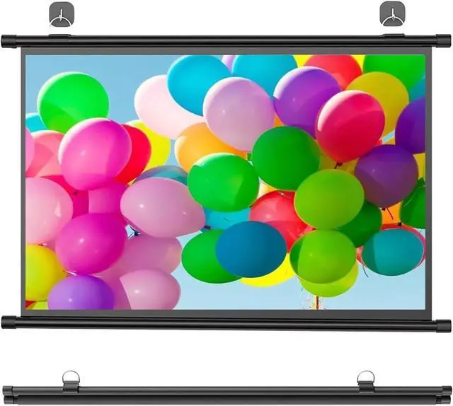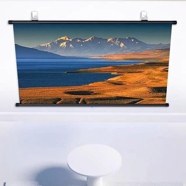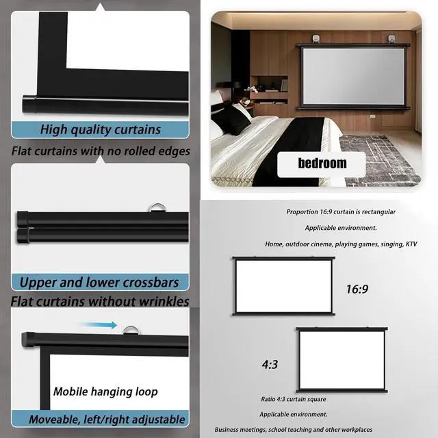 [Easy Installation]: With two hooks on both sides, it can be easily installed on the ceiling or wall. The design is stylish and you can roll it up and place it anywhere convenient. Manual pull-down movie screen, lightweight for easy storage and portability