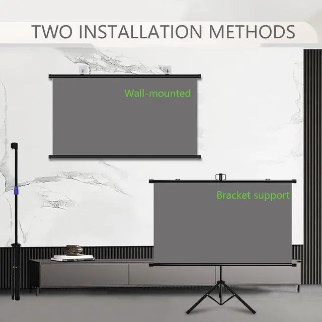 The screen can be used in two ways (supported by a stand or hung on the wall).