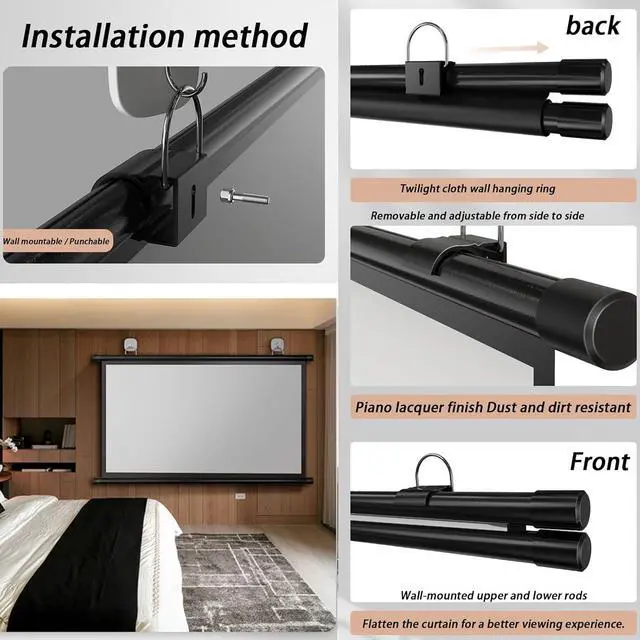 • Installation: The projection screen can be easily installed from left to right using sticky hooks, the projection screen hooks can be adjusted from left to right, and the non-hole design will not damage the wall. High cost performance