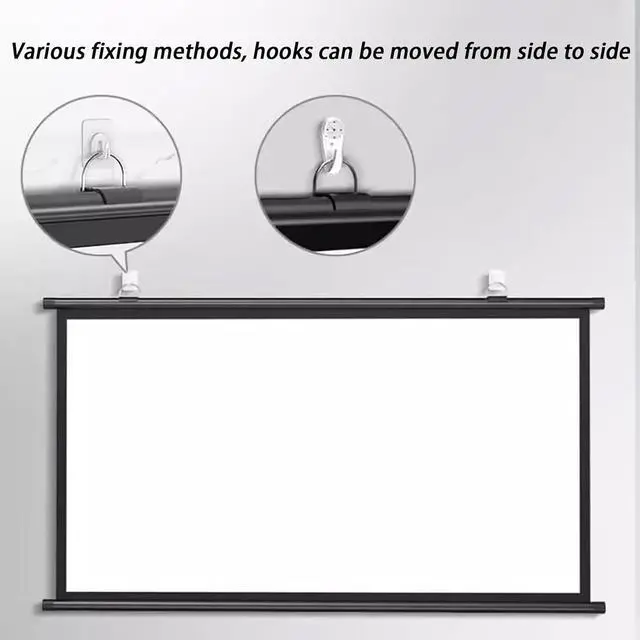 Installation: The projection screen can be easily installed from left to right using sticky hooks, the projection screen hooks can be adjusted from left to right, and the non-hole design will not damage the wall. High cost performance