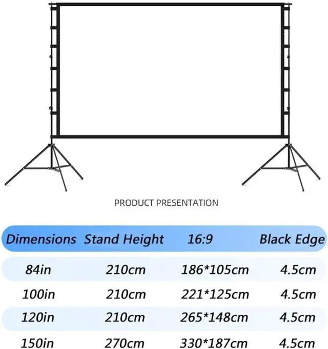 The portable screen comes with a tripod for enhanced stability indoors and outdoors. When disassembled, it occupies minimal space and fits easily in bedrooms, living rooms, or corners