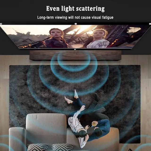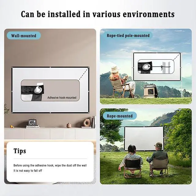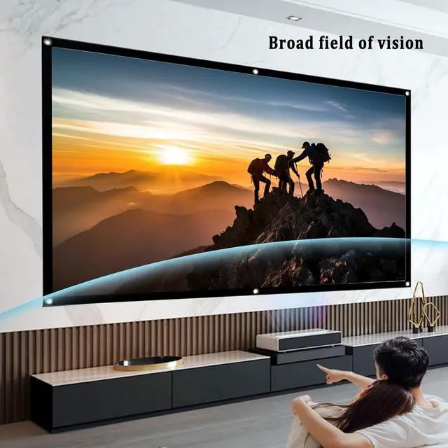 Different from other traditional cinema screens, the projection screen made of nano material can effectively improve the projection contrast, the clear image screen can reduce the light passing through, the picture is brighter and more vivid, the metal hanging ring allows it to be suspended by ropes, nails, hooks and other installation tools, it can be folded and compact when not in use, easy to carry