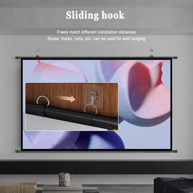 Adjustable hanging ring: The U-shaped hanging ring on the hanging rod can be adjusted left and right to adapt to different installation distances. The scroll-type storage method, the projection screen after storage, takes up little space and is easy to carry