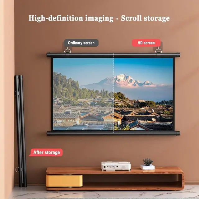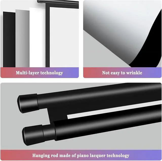 Sturdy hanging rod: Indoor Pull Up Portable Projector Screen, The upper and lower hanging rods made of piano lacquer technology keep the screen flat for a long time, not easy to curl or wrinkle, and can be perfectly integrated with various home decoration styles to bring you a better viewing experience.