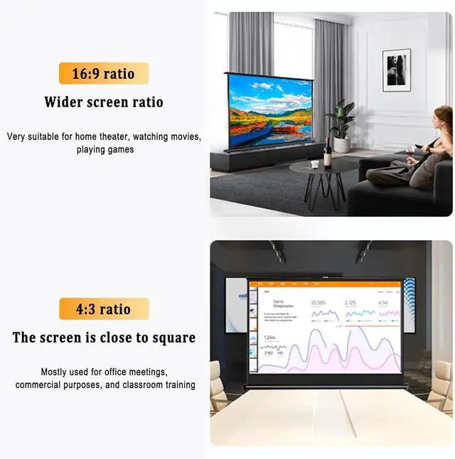 Scope of application: Two screen ratios: 4:3 and 16:9, designed for different usage needs, it is not easy to leak light from the edge of the screen or incomplete display of pictures, suitable for various indoor and outdoor occasions