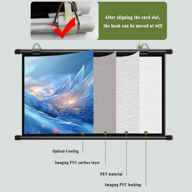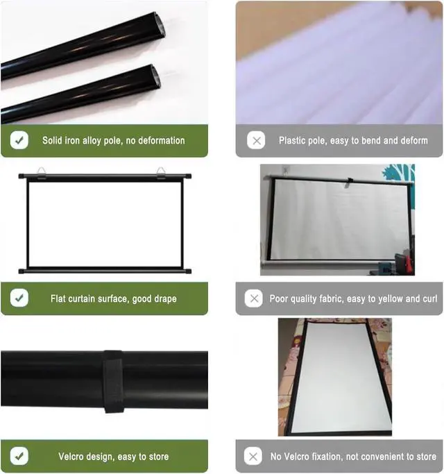 Excellent visual experience: Portable Pull Down Projector Screen, The projection screen is made of white fiberglass, with uniform thickness, fine workmanship, not easy to curl, soft colors, long-term use will not cause eye fatigue, and can provide a better viewing experience