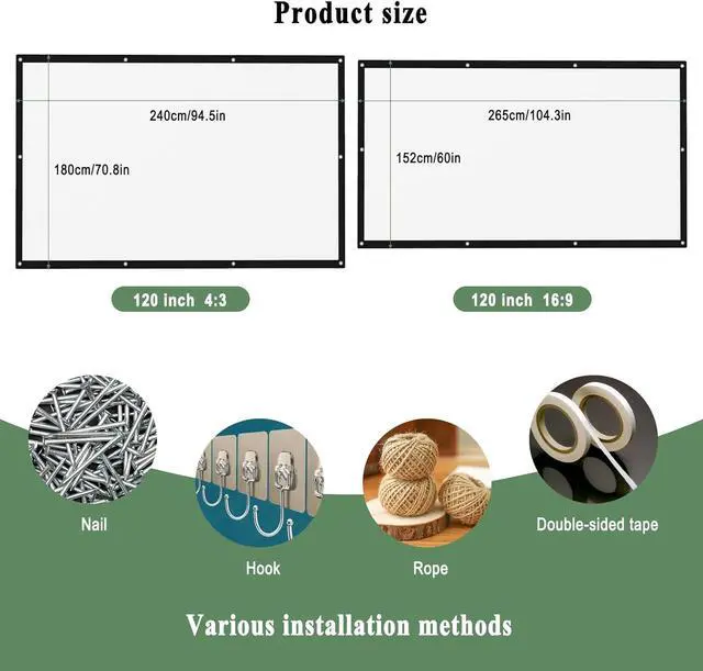 High-definition image: Indoor Outdoor Projection Screen Moive Screen, Made of nano-material, not easy to wrinkle or deform, thick and smooth, it can not only reproduce the projected image realistically, but also make the picture clearer and the color brighter