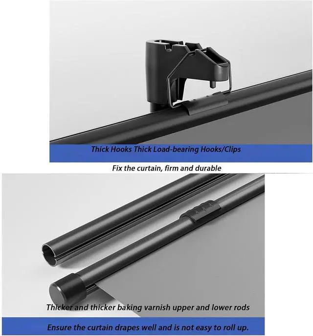 Thickened hooks, thickened load-bearing hooks/buckles, fixed curtains, strong and durable, thickened and thickened painted upper and lower rods to ensure a good drape of the curtain and not easy to curl, shaft lock, flexible telescopic, adjustable height, height Can be adjusted as needed