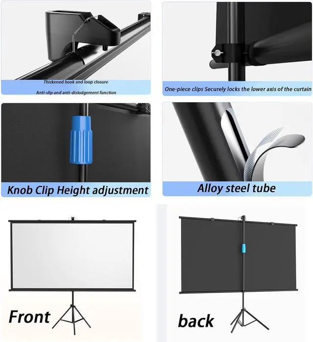 Wall Projector with Tripod: The sturdy tripod can be extended, folded and adjusted, with spring tension on the end of the aluminum tube to keep the entire screen structure stable, especially when used outdoors. The viewing height of the stand can be raised to 2.1 meters, allowing you to enjoy a comfortable experience.