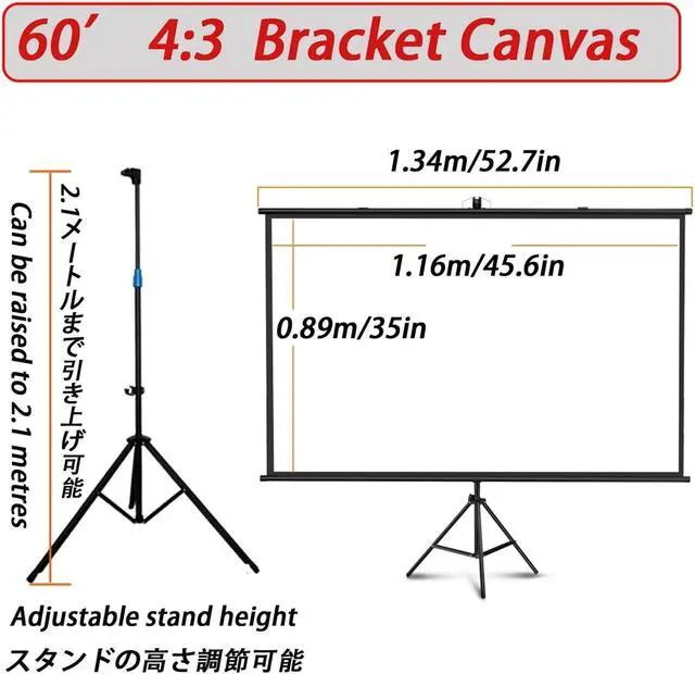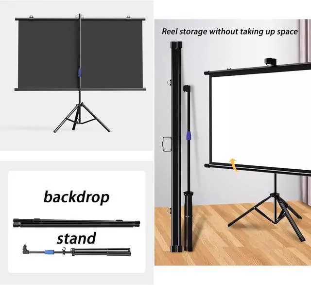 Adjustable Tripod: Sturdy metal tripod provides excellent stability and support for portable projector screens. It's also height-adjustable for easy viewing. The stand is retractable: the viewing height can be adjusted at will and can be raised to 2.1 meters, giving you a comfortable experience.