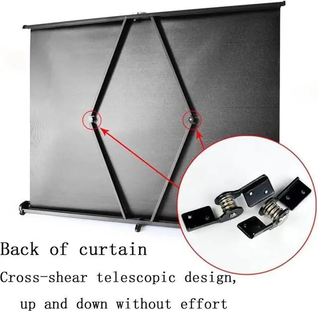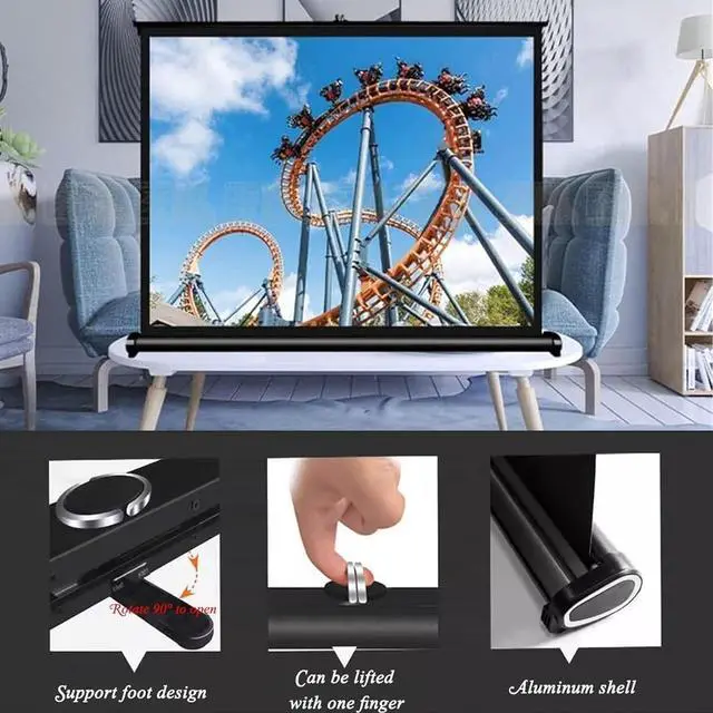 The desktop projection screen requires no installation and uses a "scissor" spring device. The casing is made of aluminum. It has a compact design, beautiful appearance, and a lightweight body. The bottom support feet allow the screen to stand on any type of flat ground or table.