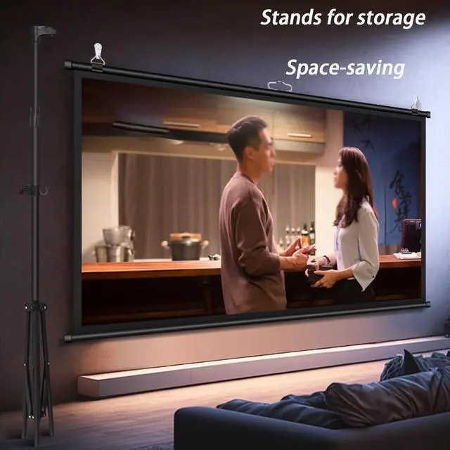 Simple and easy to operate: This is a stand-alone tripod-type projector screen. No construction is required on the wall, as long as there is room to open the tripod, it can be used. Just open the tripod, pull up the screen, and hang it on the hook. You can unlock the brakes and adjust the height of the screen.