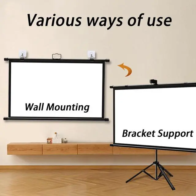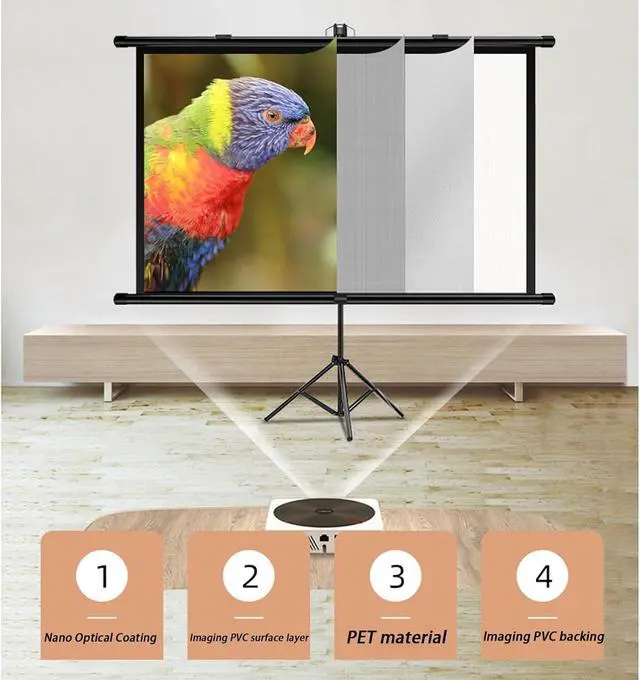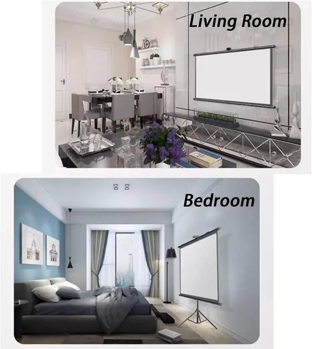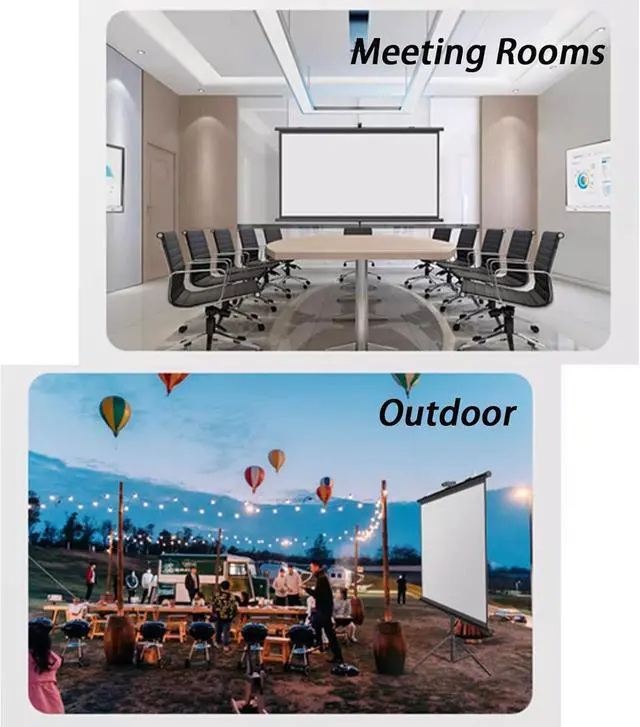 • Projector Screen with Stand: The sturdy tripod can be stretched, folded and adjusted, with spring tension on the end of the aluminum tube to keep the entire screen structure stable, especially when used outdoors.