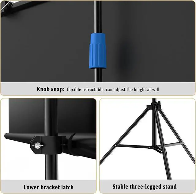 Adjustable bracketFloor-standing tripod structure, the height of the bracket can be easily adjusted, and can be locked at any desired length, when not in use can also be easily folded for storage, saving space.