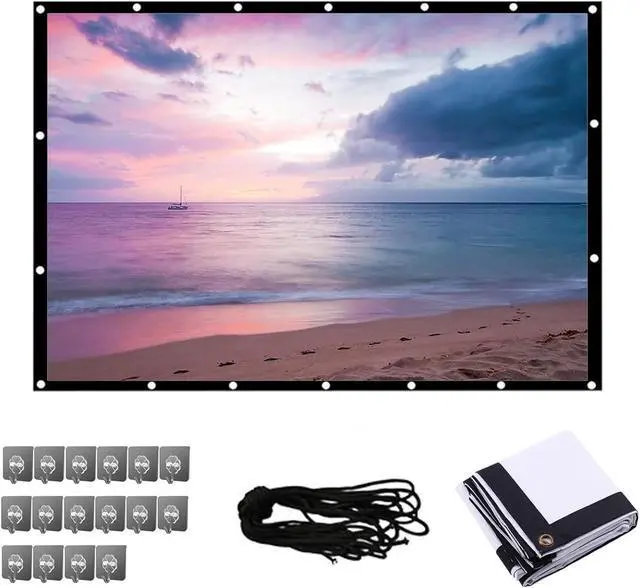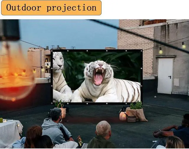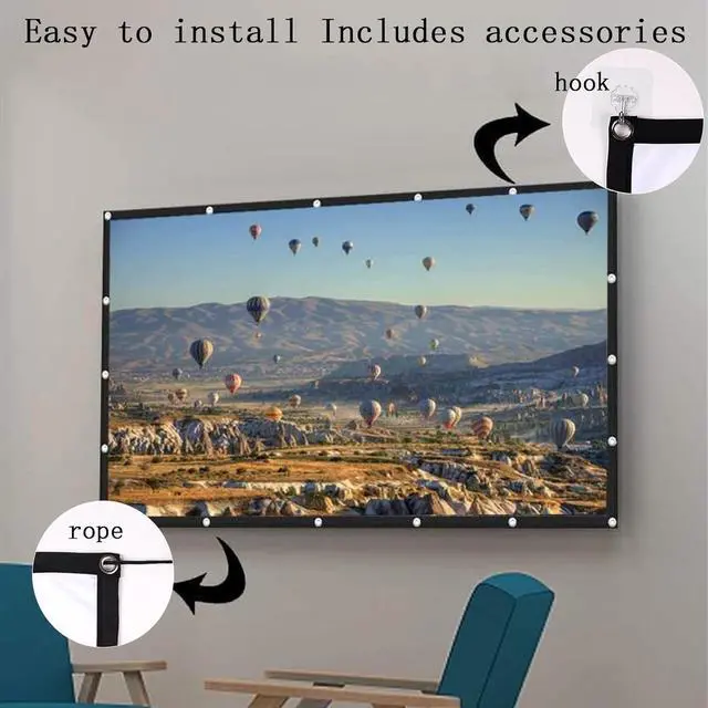 The projector screen is easy to use, designed with black edges and hanging holes, usually hung on the wall or tied to the frame, comes with all necessary tools, hooks for indoor wall installation; 2 ropes are enough for outdoor installation.