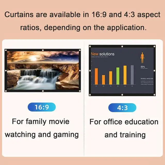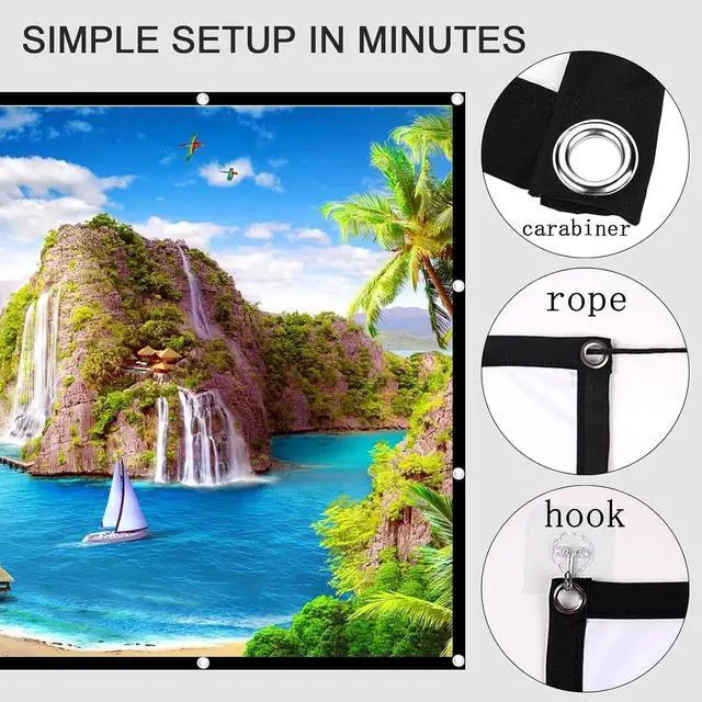The portable projection screen can be easily fixed on the wall/bracket using hooks and ropes. It is simple to use, easy to install and disassemble, saving time and effort. (Comes with sufficient mounting accessories)