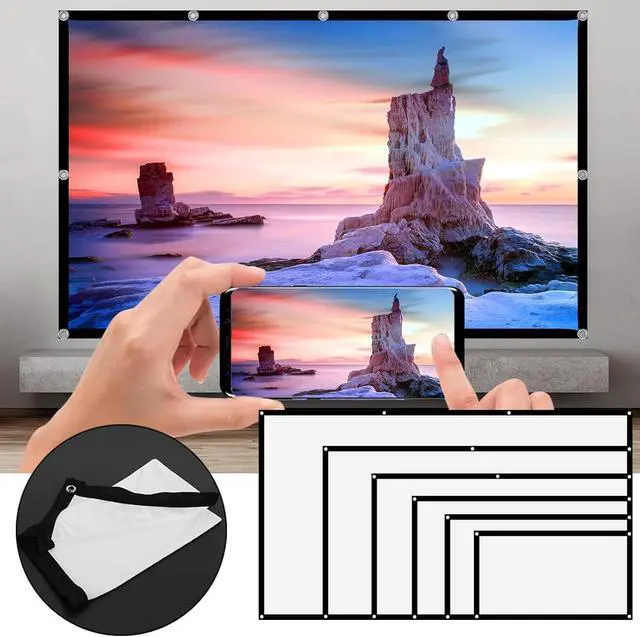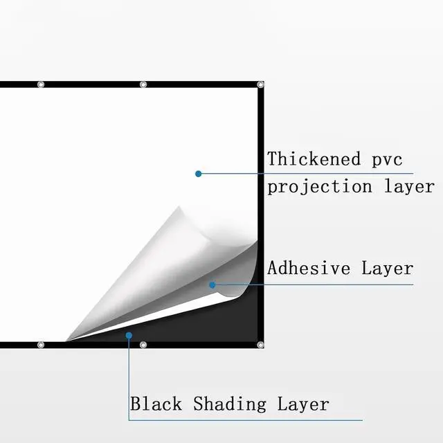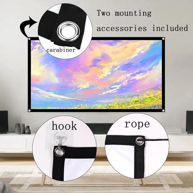 The projector screen is easy to use, designed with black edges and hanging holes, usually hung on the wall or tied to the frame, comes with all necessary tools, hooks for indoor wall installation; 2 ropes are enough for outdoor installation.