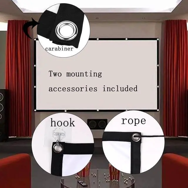 The projection screen is easy to install and can be installed with hooks/lanyards, providing a better viewing experience and stable images, and is flexible and convenient to use and install.