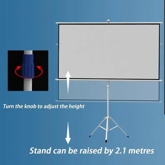 The projector stand screen is equipped with an alloy tripod to ensure stability on various floors. It has foldable legs for easy storage. The stand height can be adjusted to 2.1m by turning the knob for a comfortable experience.