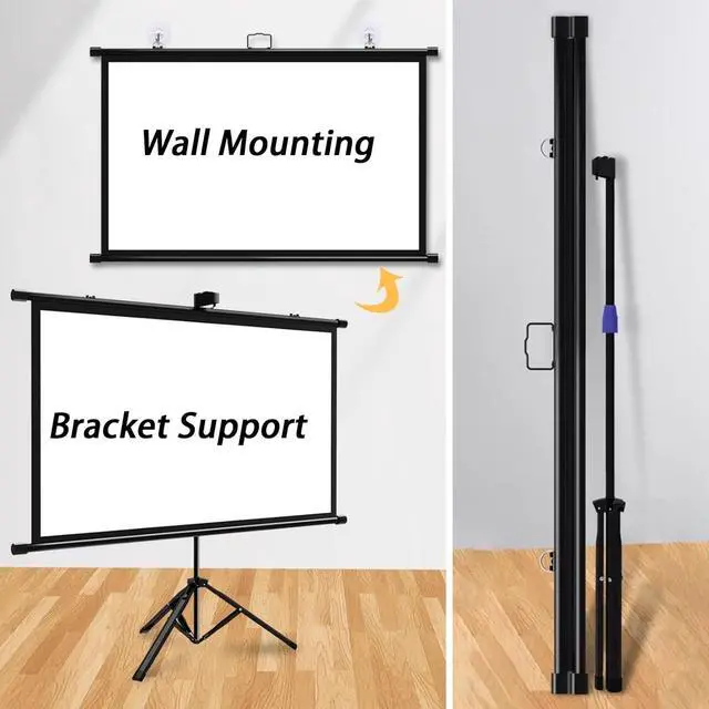 Two ways to use: The projector screen with a tripod can be installed on the wall and can be supported by a bracket, easy to store, portable and can be stored when not in use. About installation: Make sure to install it in a flat and stable place.