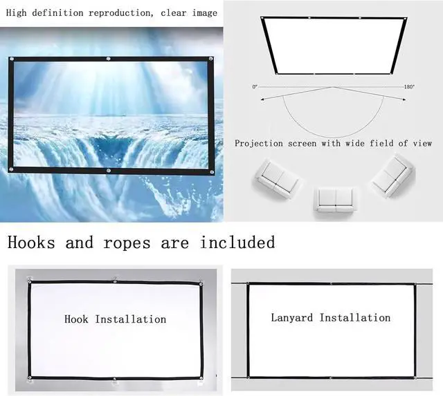 The outdoor movie screen comes with all the necessary tools, hooks for indoor wall installation; 2 ropes are enough for outdoor installation and can be installed in just 5 minutes.