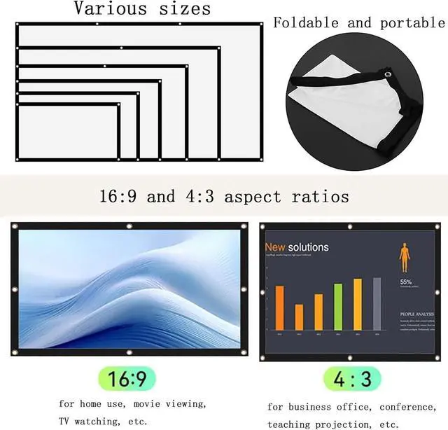Projector screen, 4K high-definition 16:9 and 4:3 ratio, wide viewing angle, can be viewed clearly from all angles. The colors are soft and will not cause eye fatigue after long-term use.