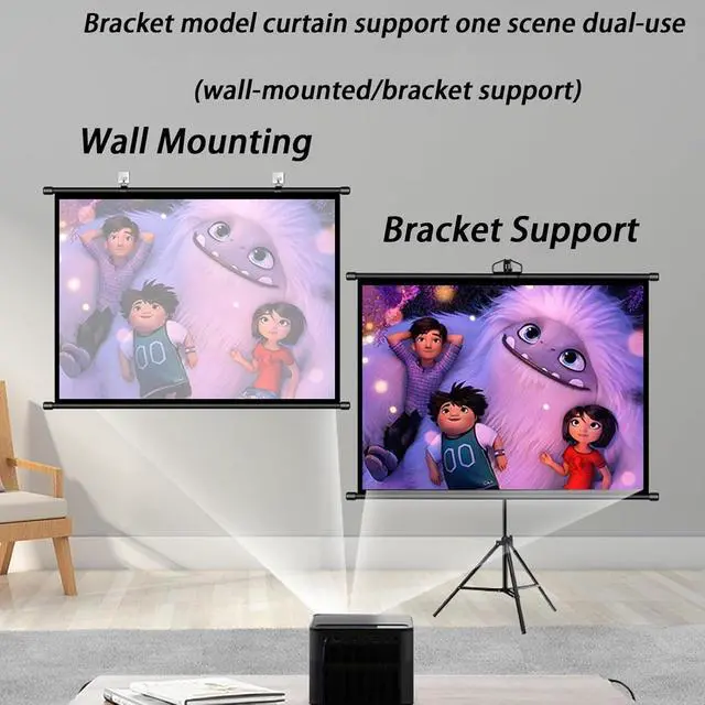Projection screen outdoor/indoor two-in-one: This projection screen has two installation modes. You can install it with a tripod, or you can use the provided wall bracket to install the projection screen on the wall. It only takes a few simple steps. Two modes.