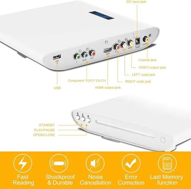 MULTIPLE ADVANCED FUNCTIONSThis DVD player also has many other advanced functions, error correction function makes it play disc quieter and smoother; last memory function memorizes your last playback; Built-in USB 2.0 port for playing picture, music and video files directly. Anti-shock protection ensures uninterrupted viewing pleasure. WARRANTY: lifetime support, one year warranty, prompt response within 24 hours.