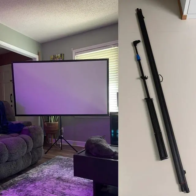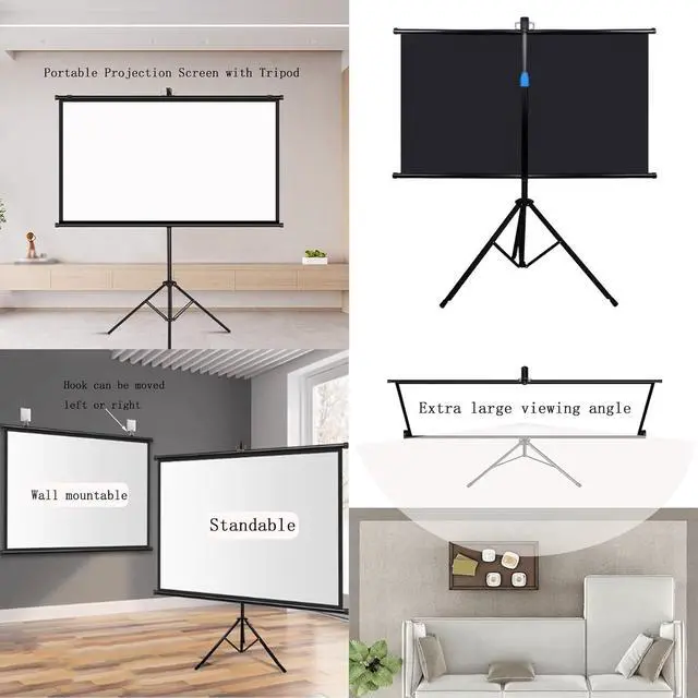 Tripod projection screens do not require any construction on the wall and can be used as long as there is space to open the tripod. Just open the tripod, pull up the screen and hang it on the hook.
