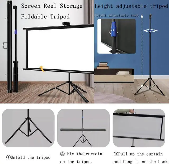 Features: High-definition imaging, wrinkle-resistant and waterproof, foldable tripod, curtain roll storage