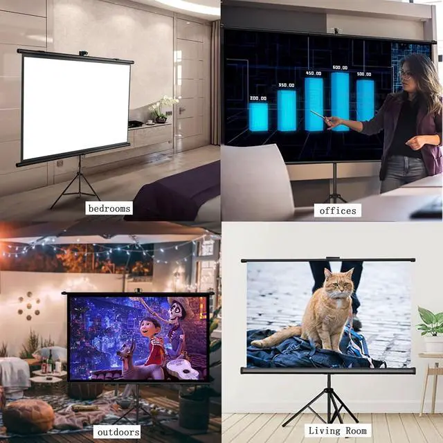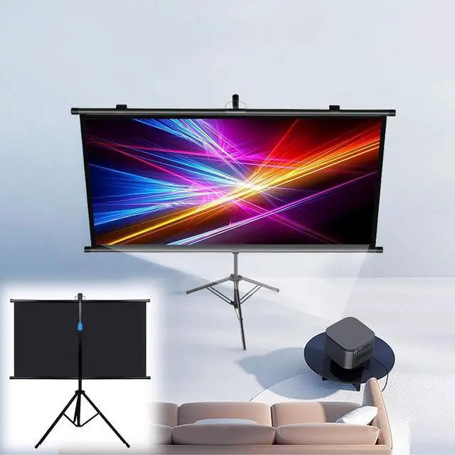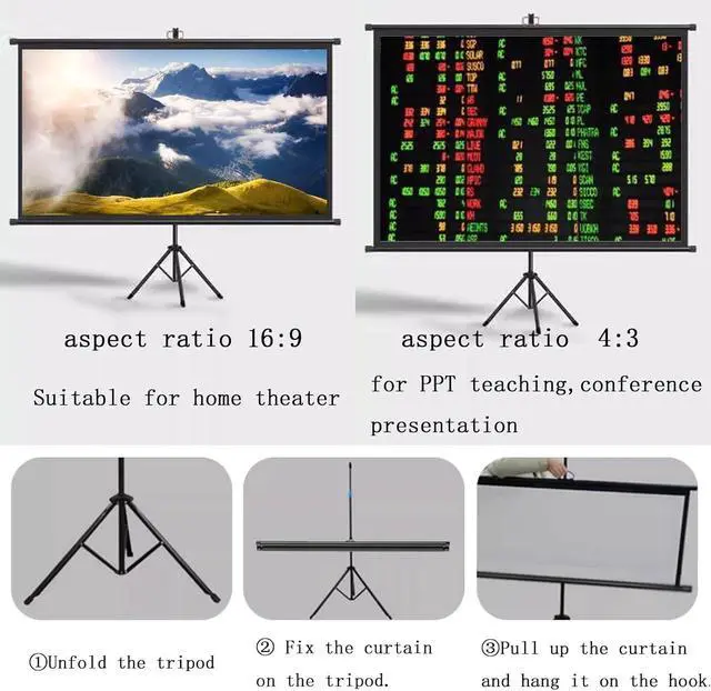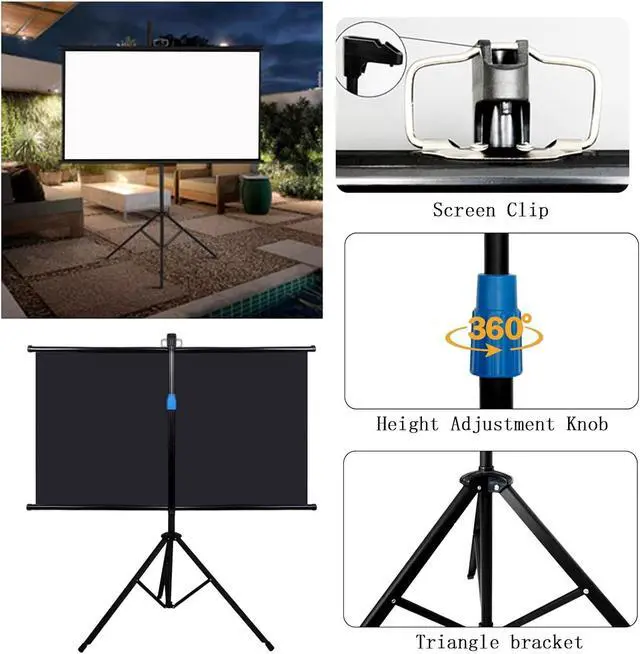 The projection screen is made of high-quality white fiberglass to produce realistic colors. The tripod is made of metal and is durable. It can be folded and adjusted in height to keep the entire screen structure stable.