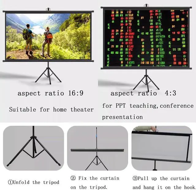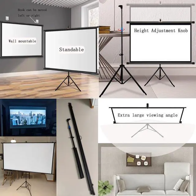 [Easy to Use] The tripod projection screen does not require any construction on the wall, it can be used as long as there is space to open the tripod. Just open the tripod, pull up the screen and hang it on the hook.
