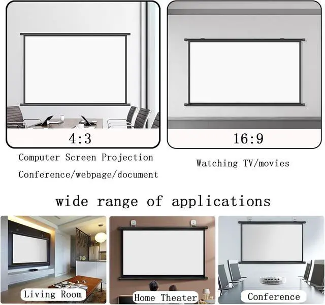 60/72-inch projection screen, 16:9 and 4:3 image formats available, 16:9 image format for impressive home theater experience, 4:3 image format for education/computer screen projection Conferences/Websites/Presentations.