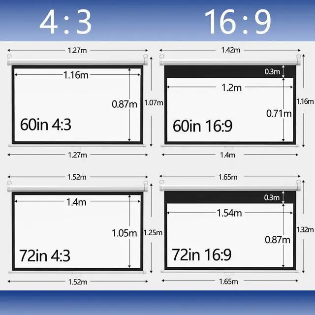 Screen format: 4:3 16:9 aspect ratio, 2.5 gain, to give you perfect visual enjoyment with the best image and color reproduction