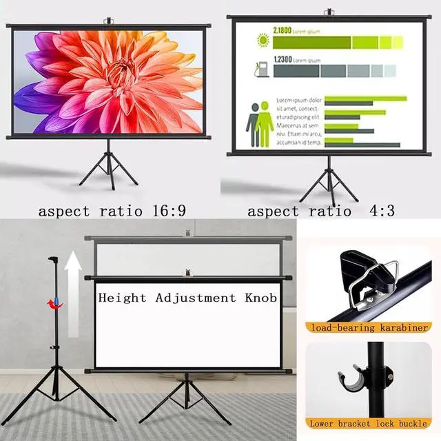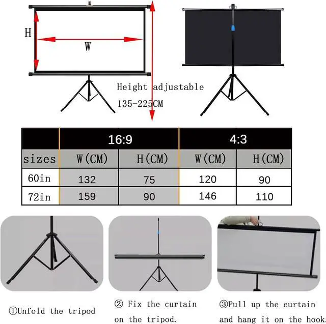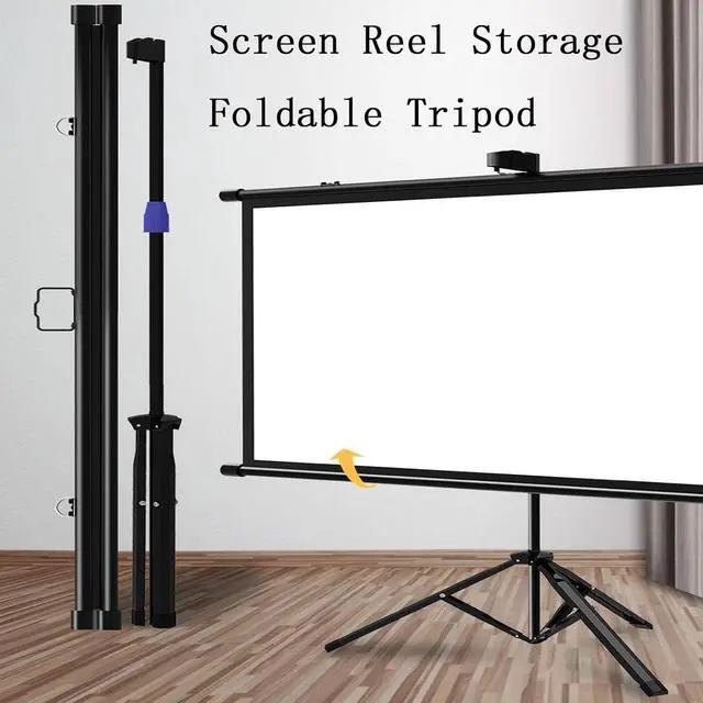Easy to useThe projection screen can be stored in a roll, and the tripod is foldable, making it easy to carry. As long as there is space, open the tripod, pull up the screen and hang it on the hook.