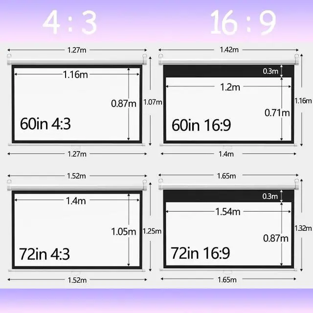 Sizes: 60in-4:3 (1.16x0.87m), 60in-16:9 (1.2x0.71m), 72in-4:3 (1.4x1.05m), 72in-16:9 (1.54x0.87m)