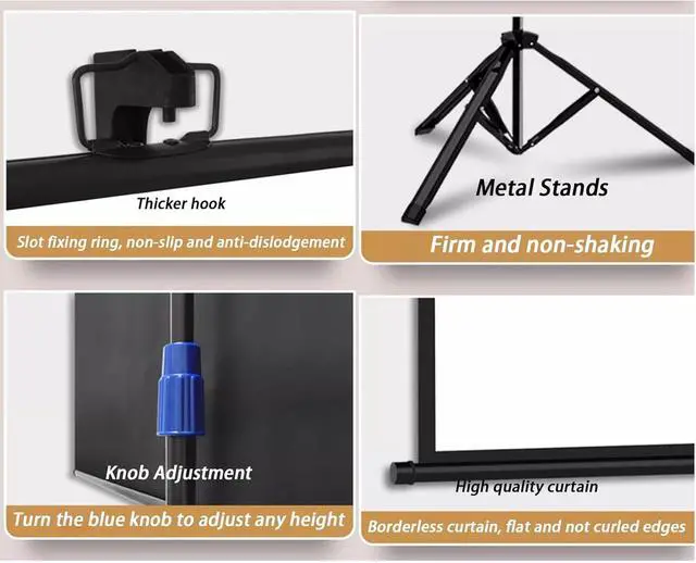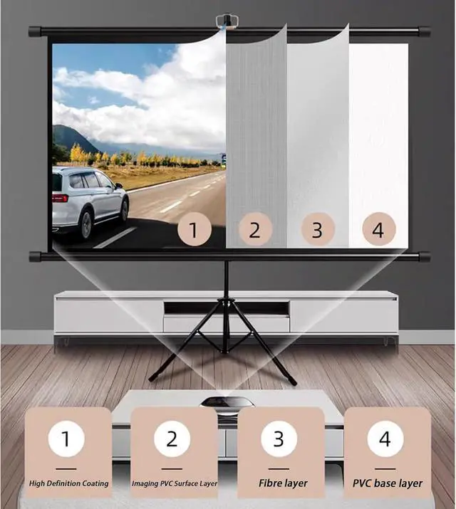 Premium viewing experience: The projector screen has a 4:3/16:9 HD aspect ratio, anti-wrinkle design, and the image is bright and clear, suitable for various indoor and outdoor environments.