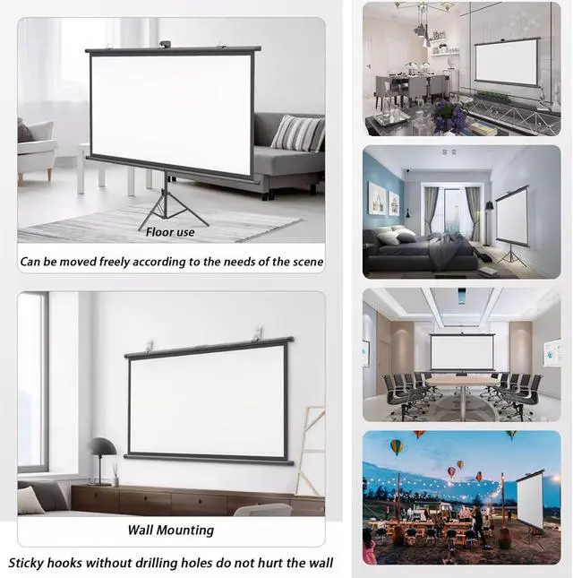 Wide-angle screen: The projection screen with a stand has a 60", 72" diagonal display area, allowing more people to enjoy blockbusters together. The wide 160-degree viewing angle means there's no glare or lumen loss, even in well-lit offices, while also diffusing light in all directions.
