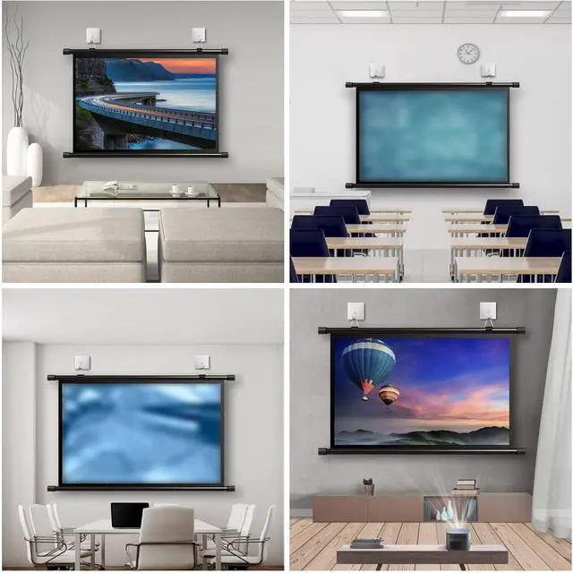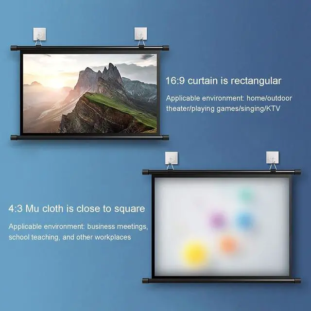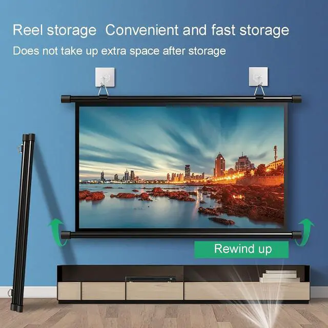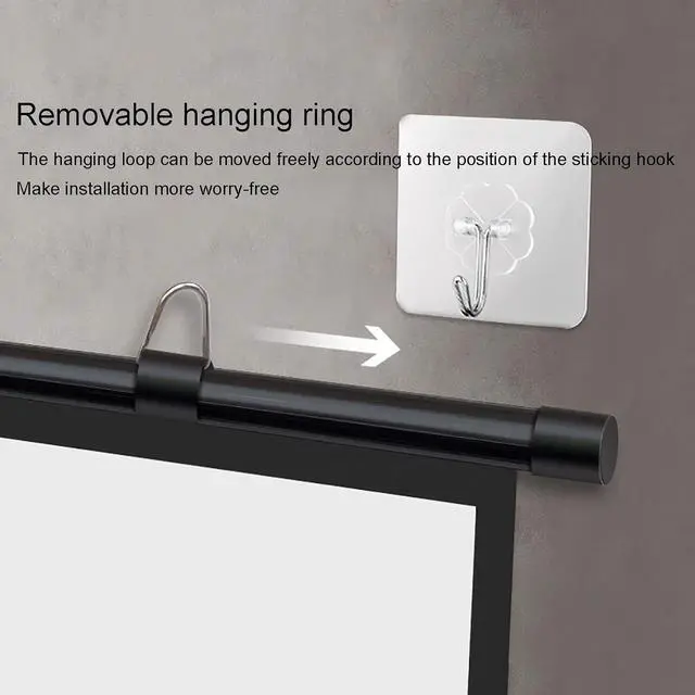 This projection screen can be easily attached to the wall hooks, or it can be removed at any time. The projection screen is compact and can be placed in the corner after folding, which is very portable.