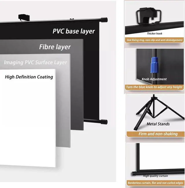 Adjustable Tripod: Made of sturdy alloy, the tripod provides excellent stability and support for your portable projector screen. You can adjust it to 2.1m for better viewing.