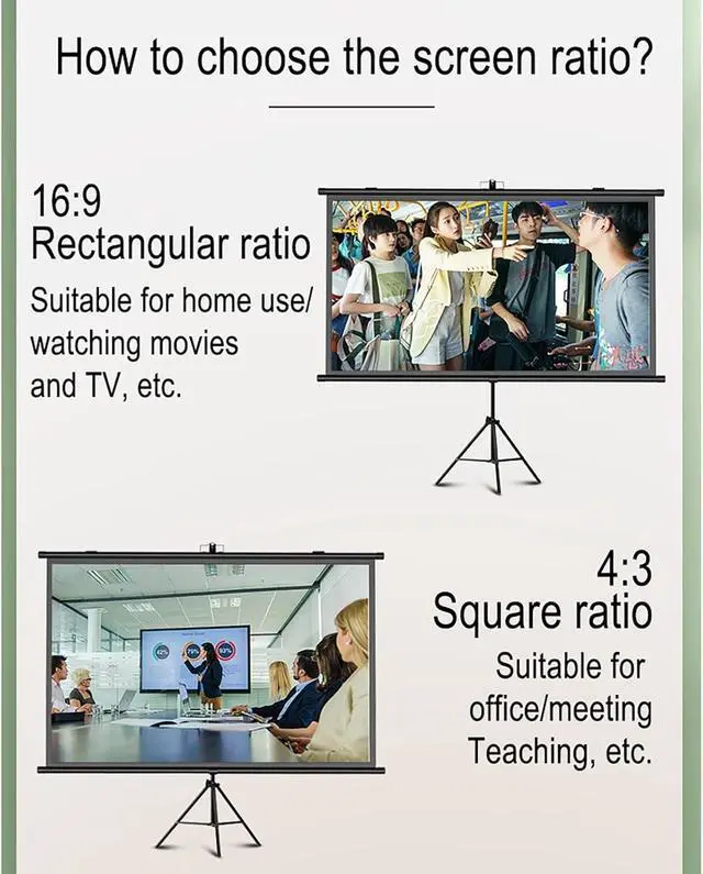 The portable projector screen has a vertical ratio of 16: 9 and 4: 3, and the 60/72-inch diagonal projection screen has a 160 ° wide perspective.