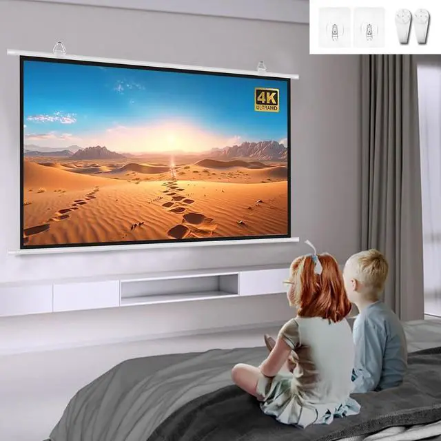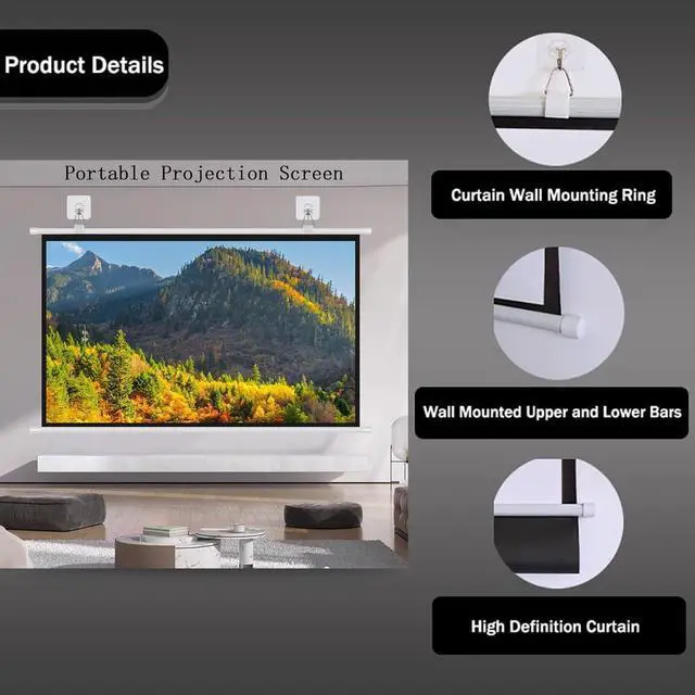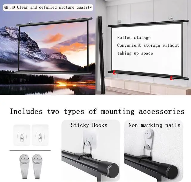 The projector screen has two installation methods: wall-mounted and hole-punched. It comes with 2 adhesive hooks and 2 nails to suit walls of different materials. The hanging ring is flexible and can be freely adjusted.