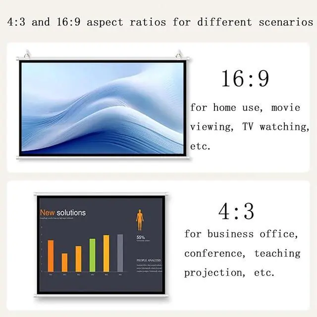 The projection screen is available in 4:3 and 16:9 aspect ratios with a wide viewing angle of up to 160°, so you don't need to sit directly in front of the screen, just choose the most comfortable viewing position to enjoy a great movie night.