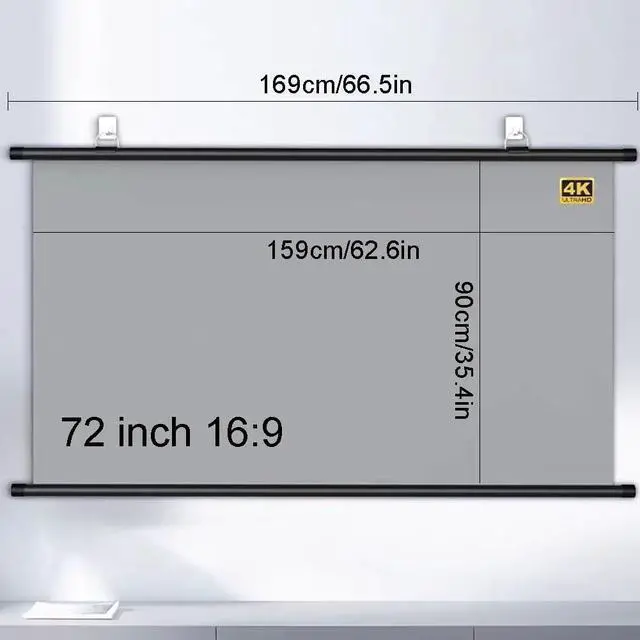 Specification size, projection screen 60/72 inch diagonal, with 16:9/4:3 aspect ratio, 178° viewing angle