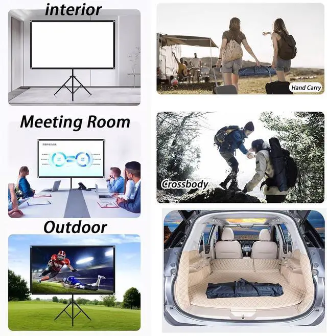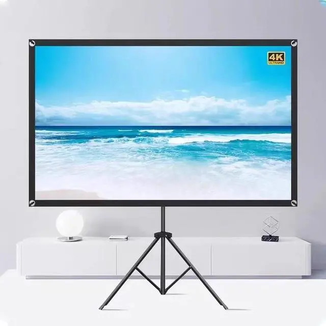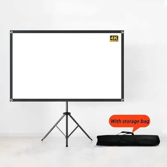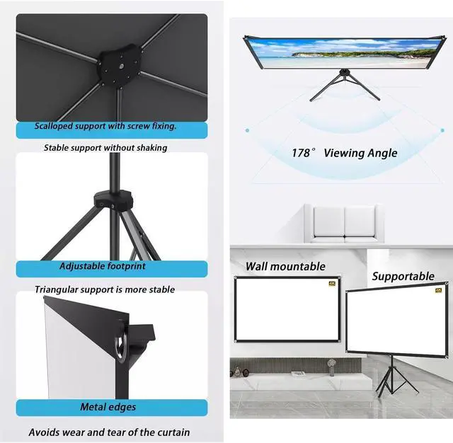 Projector Screen with Stand: The sturdy tripod can be stretched, folded and adjusted, with spring tension on the end of the aluminum tube to keep the entire screen structure stable, especially when used outdoors. The stand is retractable and the screen height can be adjusted with a knob.