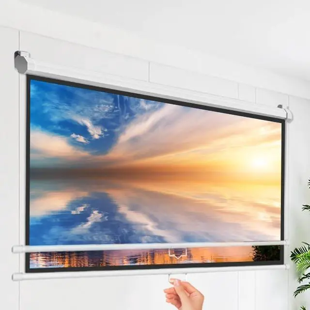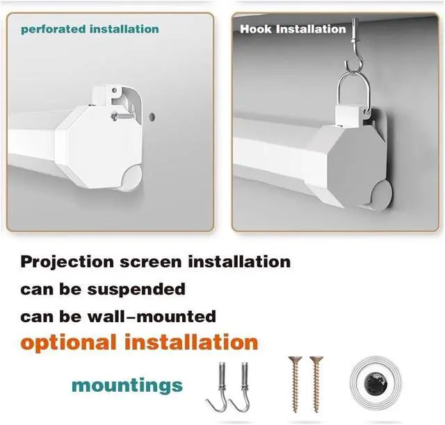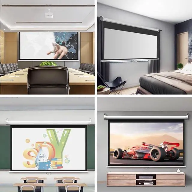 Projection screen made of white fiberglass with black backing to eliminate light penetration Product Name: Projection Screen Projection screen ratio: 16:9 Installation: ceiling, hanging installation Package included: 1 x projection screen + all accessories Easy to install: drop-down projection screen with automatic locking system, can be set at various heights Note: line shooting and different monitors may cause the color of the items in the picture and the physical object has a slight difference, this product is manually measured, please allow 1-3 cm error, thank you for your understanding