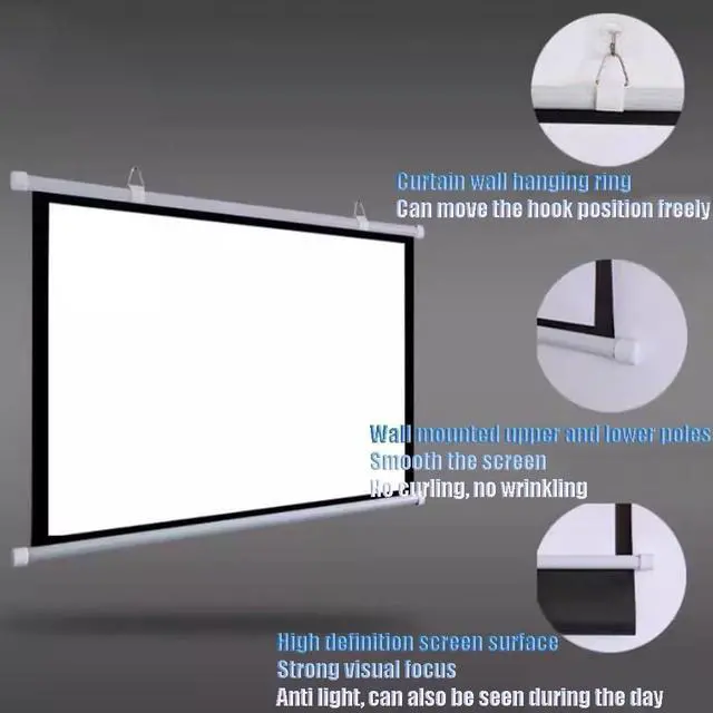 Portable and easy to install: Our hand-pull-down projection screens are lightweight and easy to carry, making them ideal for use on the go. Whether you want to hang it on the wall or mount it on the ceiling, the installation process is quick and easy