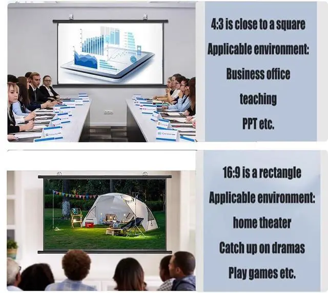 Wide application: 60 inches/72 inches, 16:9 for entertainment, games, KTV, 4:3 for office meeting, teacher teaching, public presentation, etc.